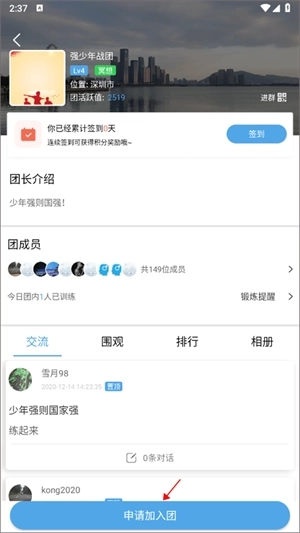 5、加入团队后,你每天都能在这里点击签到功能,但入团需要经过团长的同意。在这个页面,你可以看到团队成员的信息以及他们各自的活跃值,点击下方的“申请加入团”按钮,若确定要加入,直接点击确定即可完成申请。