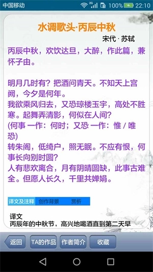 2、内容齐全:我们为每一首诗都提供了完整的原文、注解、译文和赏析,让用户充分了解作者的用词、意境和文化内涵。