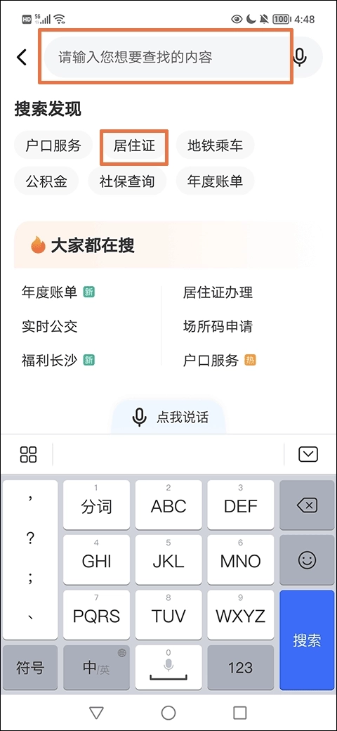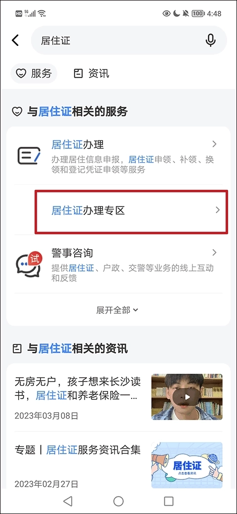 2、在搜索结果展示页面,找到并点击“居住证办理专区”按钮选项;