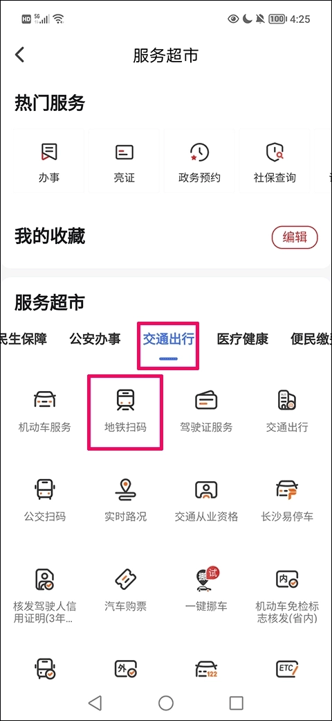2、在服务超市界面的交通出行板块里找到“地铁扫码”按钮选项并点击它;