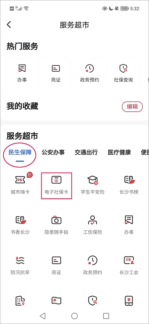 2、在服务超市的民生保障一栏中找到并点击“电子社保卡”按钮选项;