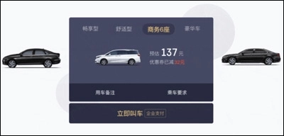 填写信息后选择乘坐的车型和乘车要求(代人叫车、指定司机),点击【立即叫车】按钮即可使用企业支付下单。