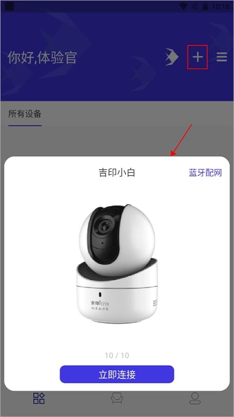1、第一步,点击首页右上角的“+”号,然后选择摄像头设备。