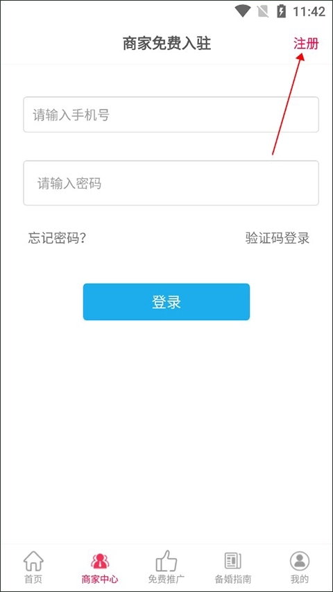 1、打开茄子婚庆app,点击底部导航栏的“商家中心”,接着点击页面右上角的“注册”按钮。