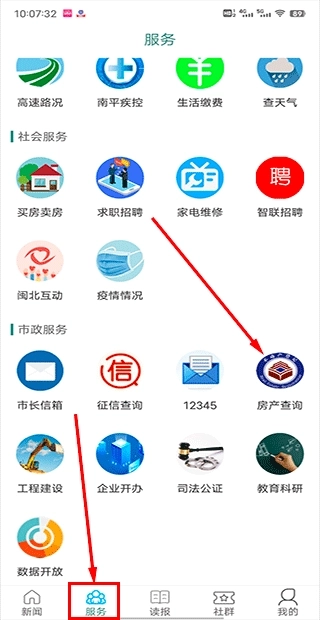 成功登录后,在下方功能栏里点击进入“服务”板块,接着在当前页面向下滑动,找到“房产查询”功能。