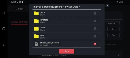 5、添加字体bin文件(路径:根目录-选择switchdroid文件-勾选shared_font_new.bin)。