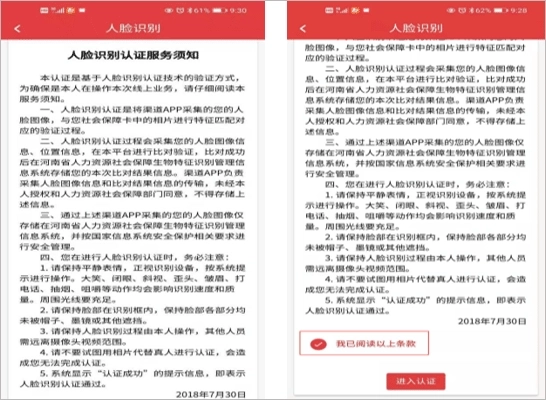 3、阅读人脸识别认证服务须知后勾选“我已阅读以上条款”,点击“进入认证”按钮,点击提示框“同意”按钮进入下一界面;