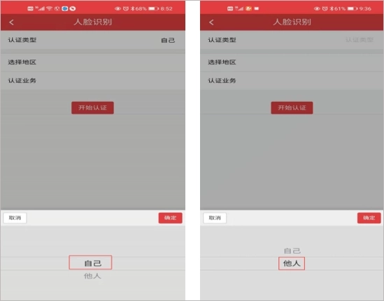 4、挑选认证类别,若选择“自己”并点击确定,即为本人完成认证;若选择“他人”并点击确定,则是为其他人完成认证。