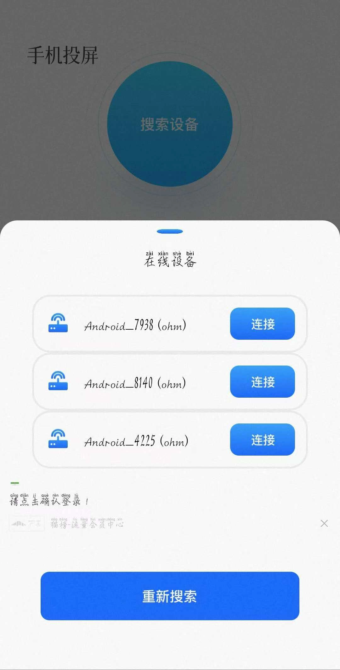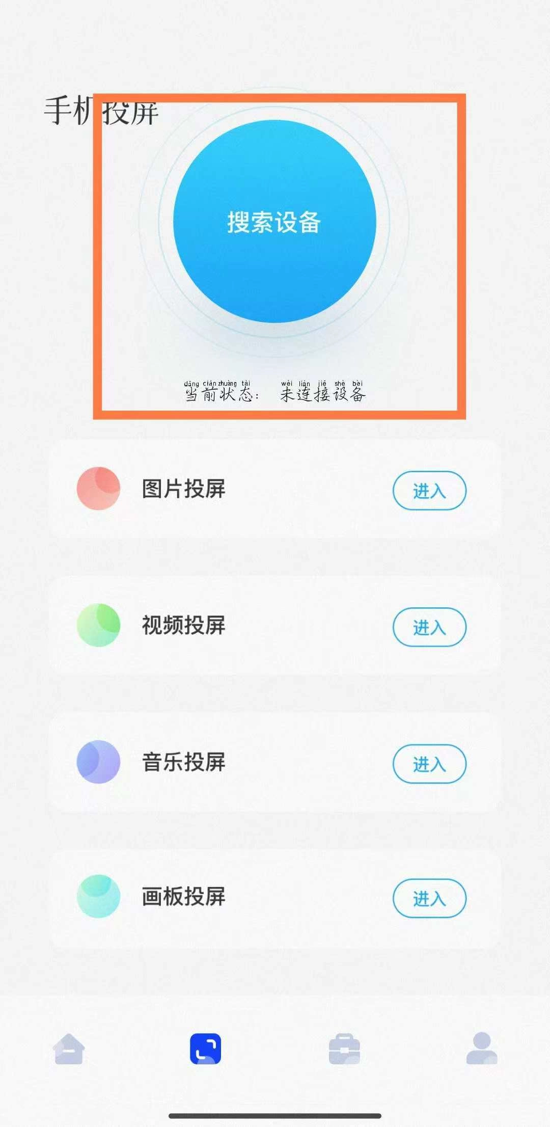 2. 点击搜索设备。确保手机电视连同一WiFi。