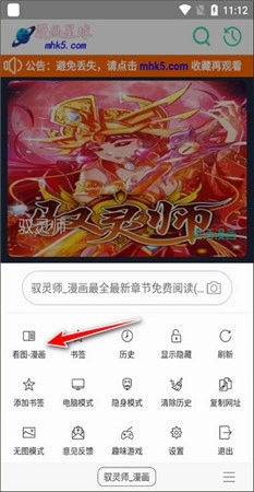 接下来,在进入漫画页面后,寻找如下图红色箭头所指的扩展图标。点击它,此时一个选项会弹出来。