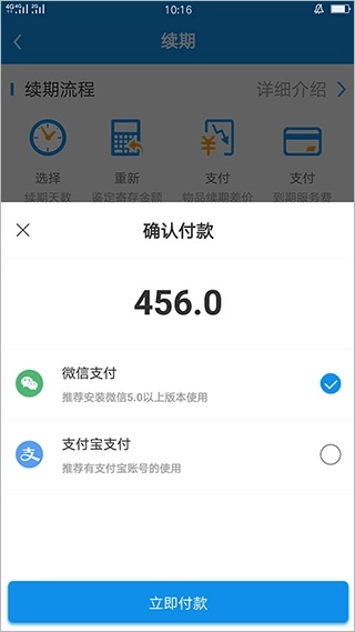 3、支付续期差价和到期服务费,支付方式支持微信和支付宝。