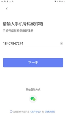 3、输入你的手机号码,并勾选用户协议和隐私政策,点击下一步