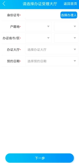 4、选择并填写相关个人信息,点击“下一步”,即可申请预约办理相关业务。