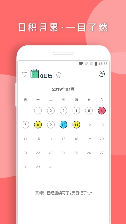 5.日历页提示坚持写日记的日数,帮助养成习惯;