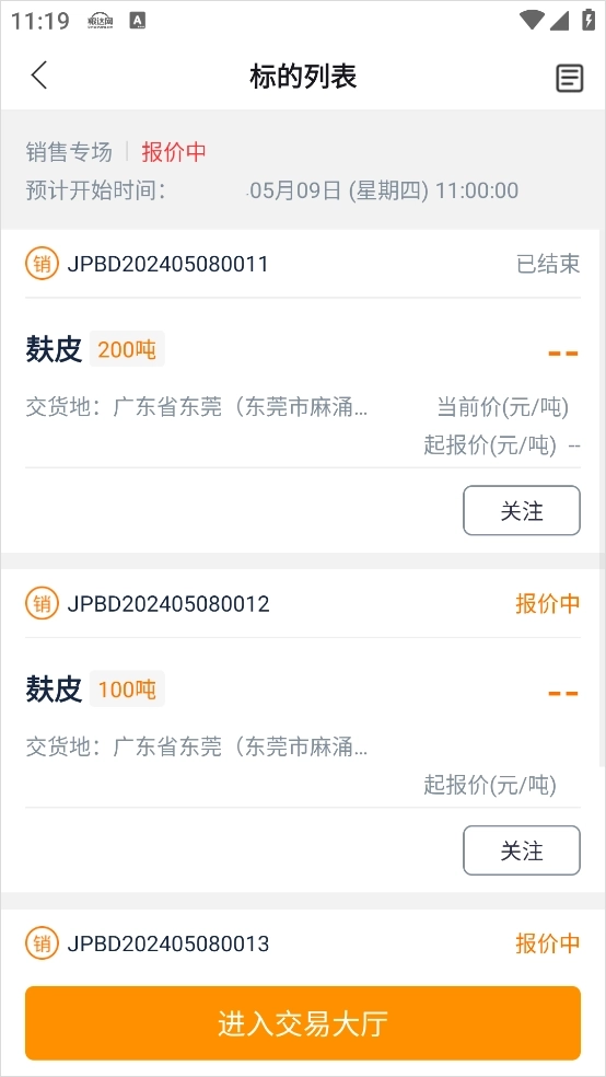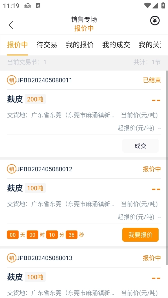 1、用户进入应用后即可在交易页面下看到正在交易的大宗粮食产品信息