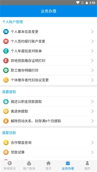 4、业务办理页面拥有管理个人账户、公积金提取、贷款管理、异地转入接续功能。