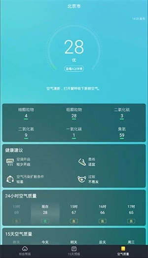 5、导航栏的第三页是专门的空气质量页面,能够为用户呈现空气质量的详细分析结果,涵盖空气质量指数、健康建议等内容。