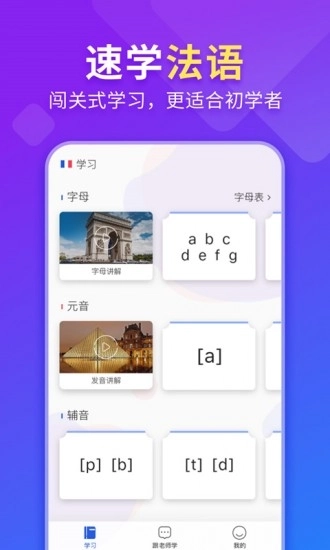- 闯关式学习:趣味学习模式,细致讲解法语基础。