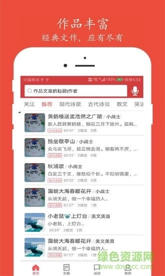 了各种优秀的文学作品,包括诗歌、散文、小说等,可以浏览和朗诵这些作品,并通过软件智能配乐功能,制作出自己的朗诵作品。