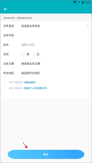 3、这时候需要填写身份证上具体的信息,像证件类型、姓名、所在地区等,勾选下方的隐私政策和个人信息授权书,点击确定。