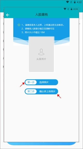5、最后一步就是正式开始人脸建档操作了,先选择你要建档的脸部照片,选好就可以确认并上传照片到app上了。