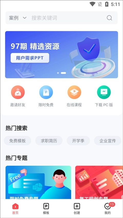 首页设有邀请好友、限时免费、在线课程、下载PC端等功能模块,同时还会推荐原创PPT模板设计。在这里,你既能找到免费且心仪的模板直接使用,也可以通过在线课堂学习来提升PPT制作的技能与知识技巧。