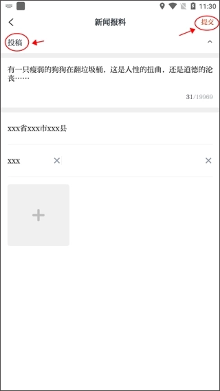 3、在报料分类里选择投稿选项,填写相关内容、位置信息和联系方式,添加拍摄的照片后提交即可。