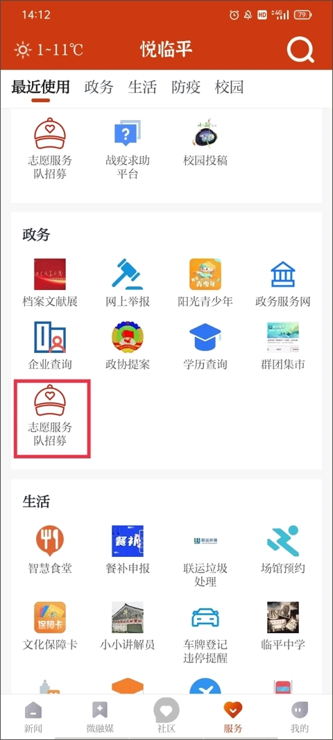 1、点击下方菜单栏的【服务】界面,该界面涵盖政务、生活、防疫、校园等板块的生活服务功能,接着选择政务板块下的志愿服务队招募选项。