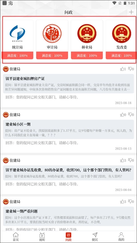 1、打开app后默认进入【首页】,点击底部菜单栏切换至【问政】界面,在界面上方选择并点击你想要进行问政的对应部门。