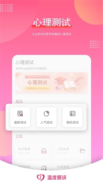 提供丰富多样的心理测试,增强用户的参与感与趣味性;依据用户的实际需求以及倾听者的专业领域,为用户提供精准的匹配服务;用户可按照分类主题挑选自己感兴趣的内容进行浏览,也能选择心仪的视频观看。