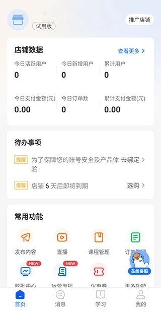 小鹅通商家版app作为助力商家快速搭建体验店铺与管理店铺的经营管理工具,能满足内容变现、营销获客、用户管理等需求,助力商家构建完整的知识付费闭环,甚至可实现一分钟打造专属知识店铺。