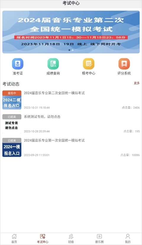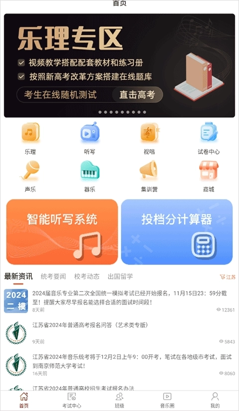 在首页能够查看乐理相关的教学版本,以及最新的报名和考试资讯。