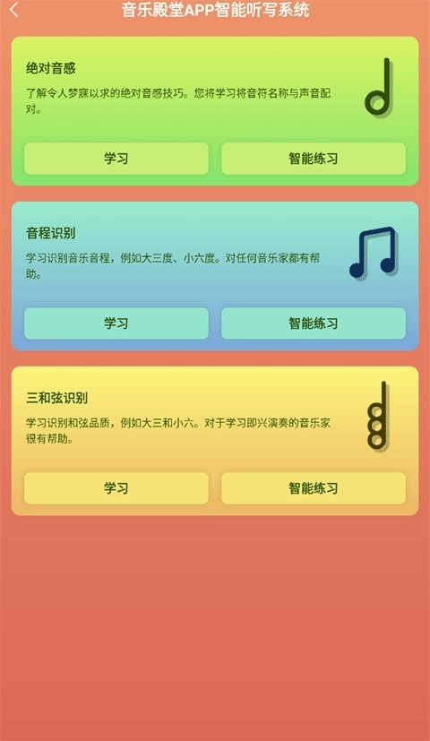 5、通过点击首页的智能听写系统可以对乐感、音程、三和弦三方面进行学习和练习,帮助你更快的成长。