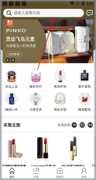 1、下载app,打开软件进入首界面,这里用户可以如下图箭头所指位置搜索自己想要的商品;