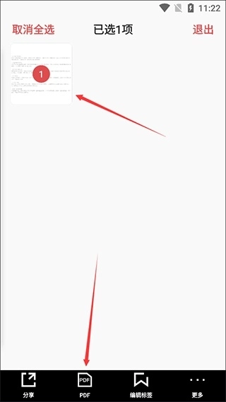 2、勾选需要生成PDF的文件后,点击下方的【PDF】按钮即可完成操作;此外,还支持一键分享文档、为文档添加标签等功能。