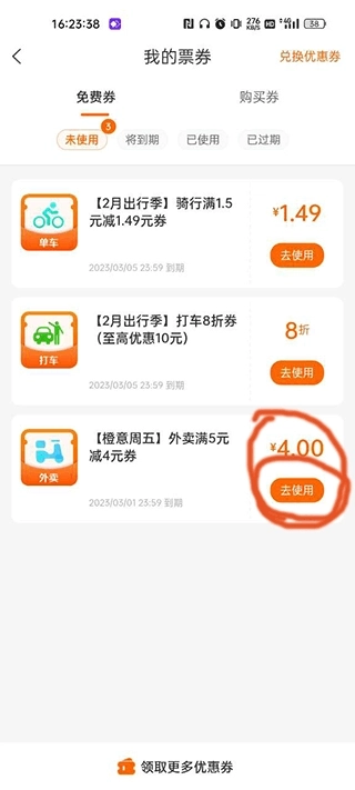 在应用程序里领取外卖优惠券后,点击“去使用”按钮。
