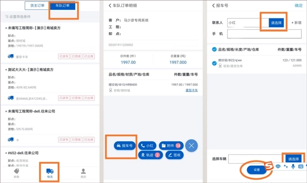 在货主订单页面与车队订单页面里,均支持对明细进行“报车号”操作。