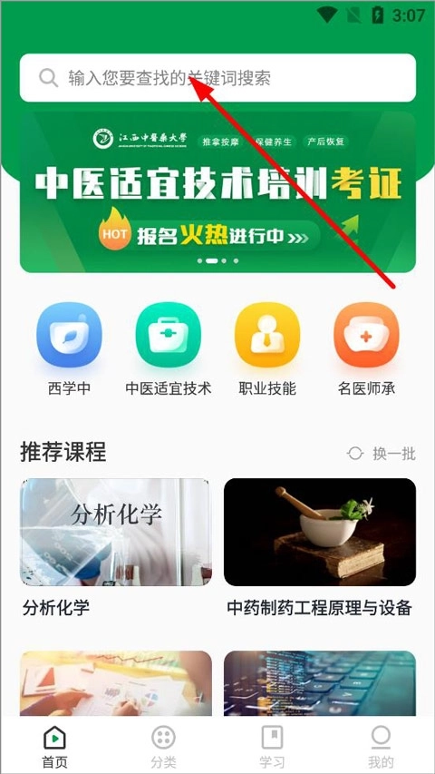 1、打开中医药在线app,完成注册登录操作后进入首页,可看到西学中、中医适宜技术、职业技能、名师传承等栏目,同时还有系统推荐的学习课程;若需查找特定课程,点击页面上的搜索框并输入关键词即可进行搜索。