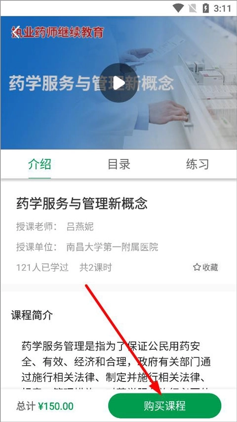 3、进入课程报名页面,有课程的简介、目录以及课后练习题,可以看到授课老师、授课单位等基本信息,点击右下角购买课程;