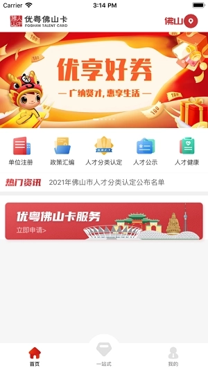优粤佛山卡APP作为佛山市人力资源和社会保障局指定的佛山人才移动服务客户端,为全市各类人才提供人才分类认定、人才扶持政策申请发放、优粤佛山卡申领、人才咨询、人才专属服务等功能。随着平台的持续完善,还将为人才提供集“政务+创业+医疗+住房+商旅+联谊”于一体的全方位贴心服务。
