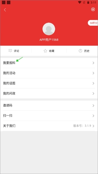 2、进入到个人中心界面,点击“我要报料”。