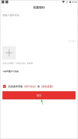 3、输入报料内容,上传图片,勾选“已阅读并同意……”,最后点击提交即可。