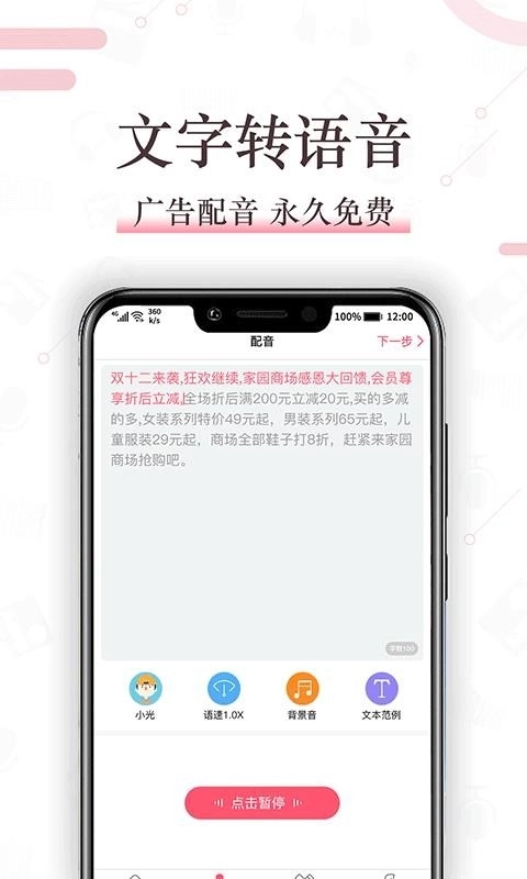 配音神器是一款免费智能语音合成工具,适用于广告促销、企业宣传、有声阅读、解说语音、教学录音等多种场景。它支持文字转语音功能,输入文字即可快速生成语音,用户可按照操作指引,从众多风格各异的人气主播中挑选合适的配音音色,选择配音类型后就能即时试听效果,全程自主操作选择;此外,该应用还具备音频导出功能,一键即可导出MP3格式文件,内置广告模板与背景音乐,用户可自行设置背景音和选用文本范例,让内容更贴合使用场景,有需要的用户可下载体验。