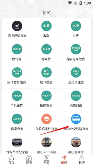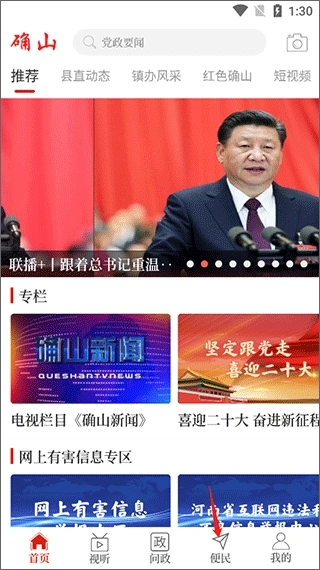1、打开云山确山app,点击底部导航栏中的“便民”选项