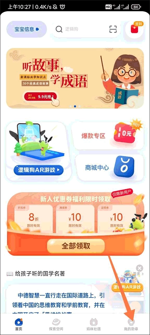 我们先打开逻辑狗APP,进入应用主页后,能看到不少适合孩子们的课程,绑定完成后可以再来浏览;接下来点击底部菜单栏里的“我的勋章”,就能进入个人界面了。