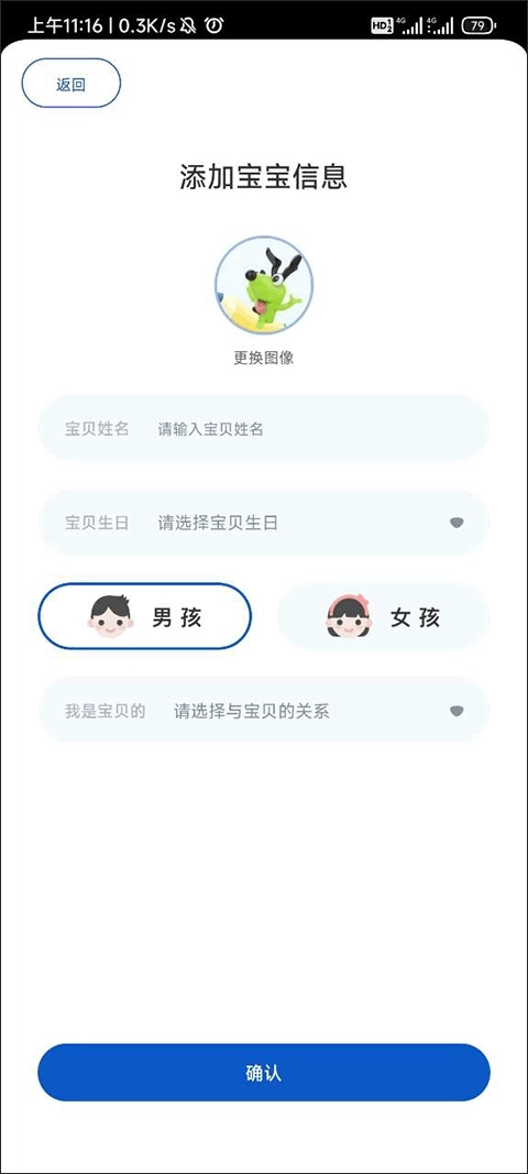 在这个界面我们只需要填写好宝宝的信息,然后上传一张宝宝的可爱照片,等都填写完成了就可以点击确认了。