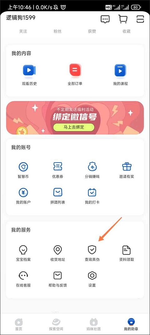 我们还是先进入app中的个人界面,在个人界面中我的服务里找到查询真伪人口并点击它。