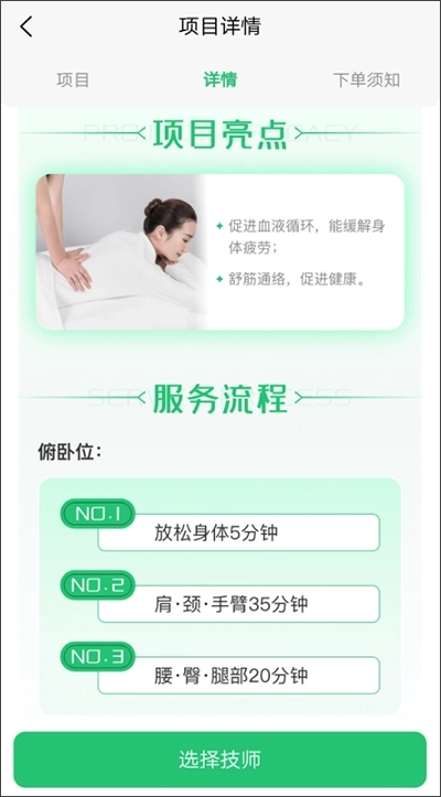 2、点击进入服务项目,可以查看到服务详情介绍、服务流程、注意事项等信息。确认无误后,点击选择技师