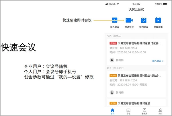 4、快速会议中企业用户:会议号随机,个人用户:会议号即手机号,创会参数可通过“我的—设置”修改