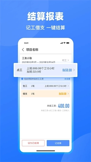3.系统为用户提供多样化功能,记工、记账、考勤管理、工资结算等一应俱全,能够充分满足多用户的使用需求。